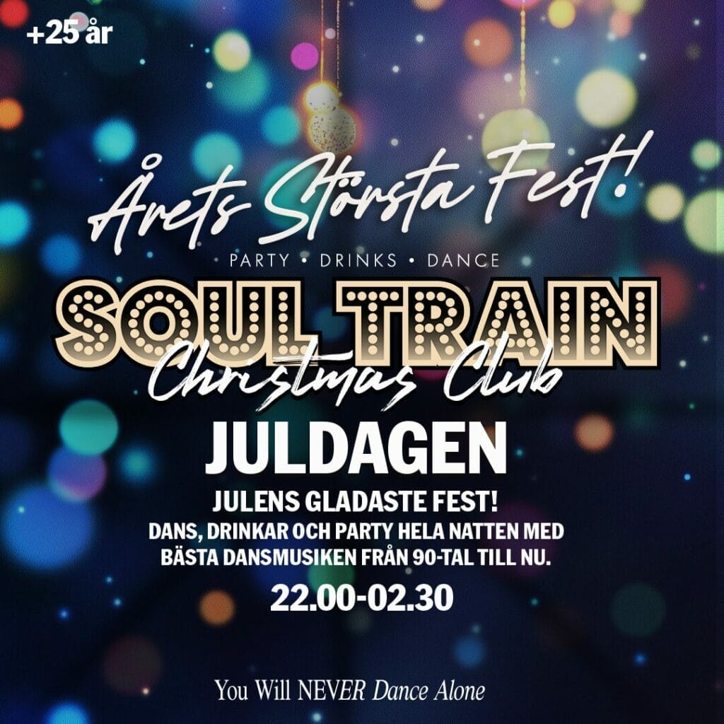Boka in företaget och kombinera julbord med Sveriges gladaste klubb. Vi serverar en härlig julbuffé med dom klassiska svenska julbordsrätterna som övergår i dans och fest med Soul Train Christmas Party.